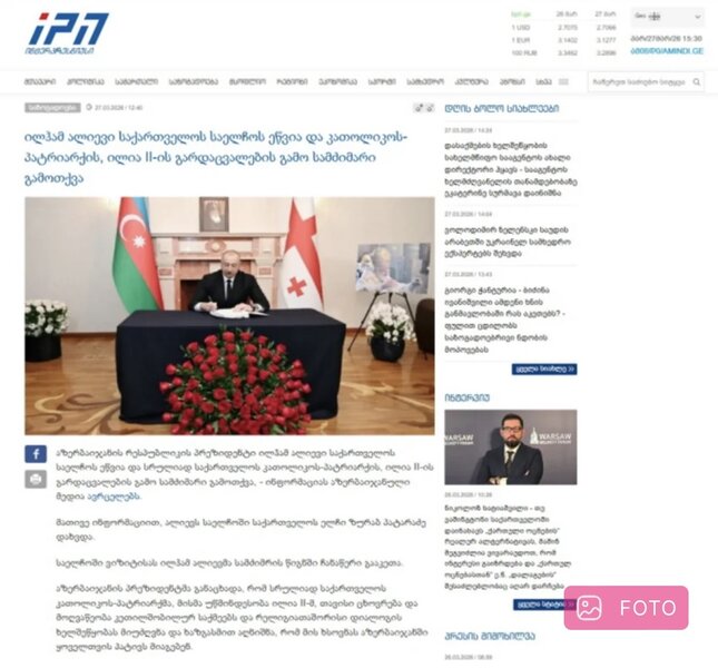 Gürcüstanın aparıcı imedi.ge, interpressnews.ge, realnews.ge, interpress.ge, 1tv.ge informasiya portalları, eləcə də ictimai televiziyası Azərbaycan Prezidenti İlham Əliyev martın 27-də Gürcüstanın ölkəmizdəki səfirliyində olması və Bütün Gürcüstanın Katalikos-Patriarxı II İlya həzrətlərinin vəfatı ilə əlaqədar başsağlığı verməsi barədə mlumat yayıblar.